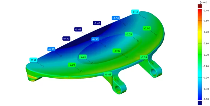 - Pomiar minimalnych i maksymalnych odchyleń od CAD w określonych obszarach.